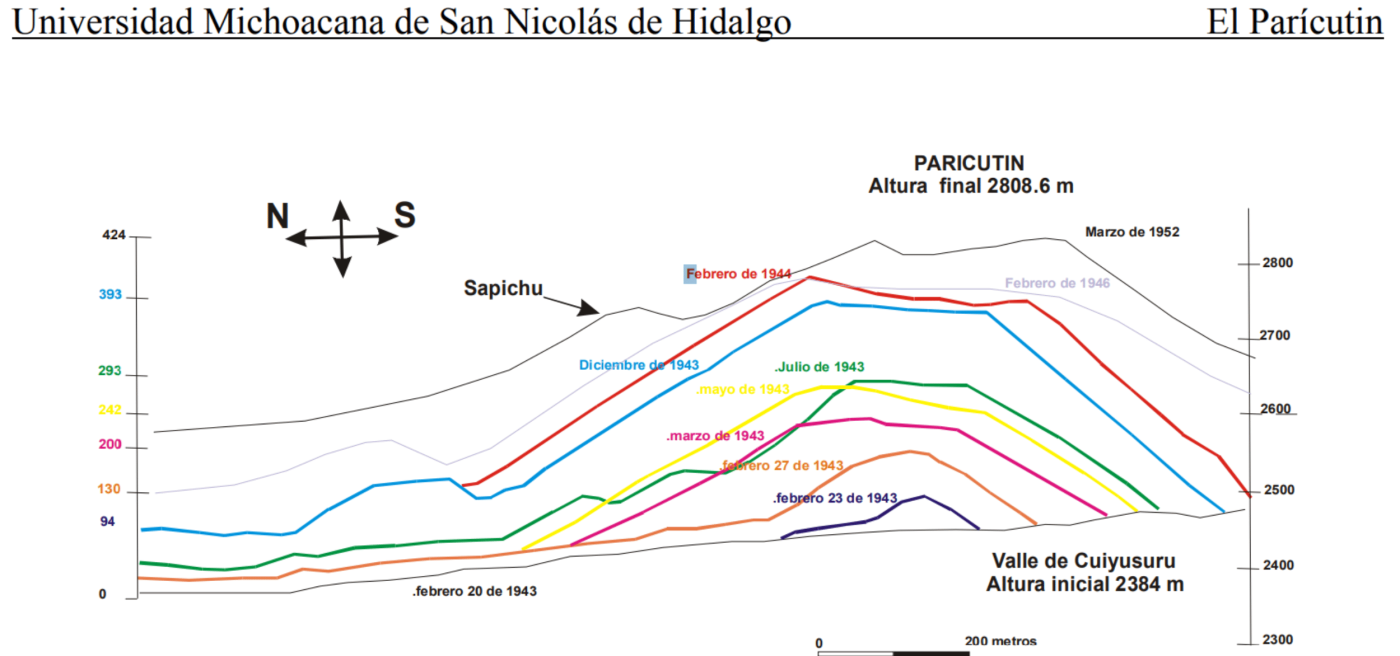 § 02 — Altimetría progresivaEl crecimiento del cono durante las primeras semanas fue extraordinariamente acelerado. El tipo de magma basáltico —fluido y con baja concentración de sílice— permitió erupciones sostenidas que acumularon material piroclástico a gran velocidad.